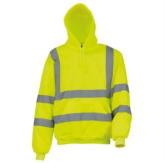 Conforms to EN ISO20471 Class 3; Made of anti-pill single jersey knitted soft-feel polyester fabric; Two 5cm width reflective tapes around the body and arms, and one over each shoulder; Attached hood with draw cord adjustment; Taped back neck for extra comfort; Drop shoulder; Knitted ribbed cuffs and waistband; Front kangaroo pocket; Twin needle stitching throughout Washing Instructions Maximum washing temperature 40ºC.Normal process and wash as synthetics. No bleaching allowed. Do not iron. Do not tumble dry or wring. Do not dry clean, cold rinse and short spin. No professional dry cleaning in perchloroethylene or hydrocarbons. Do not wash in biological powder. 25 max. wash cycle.