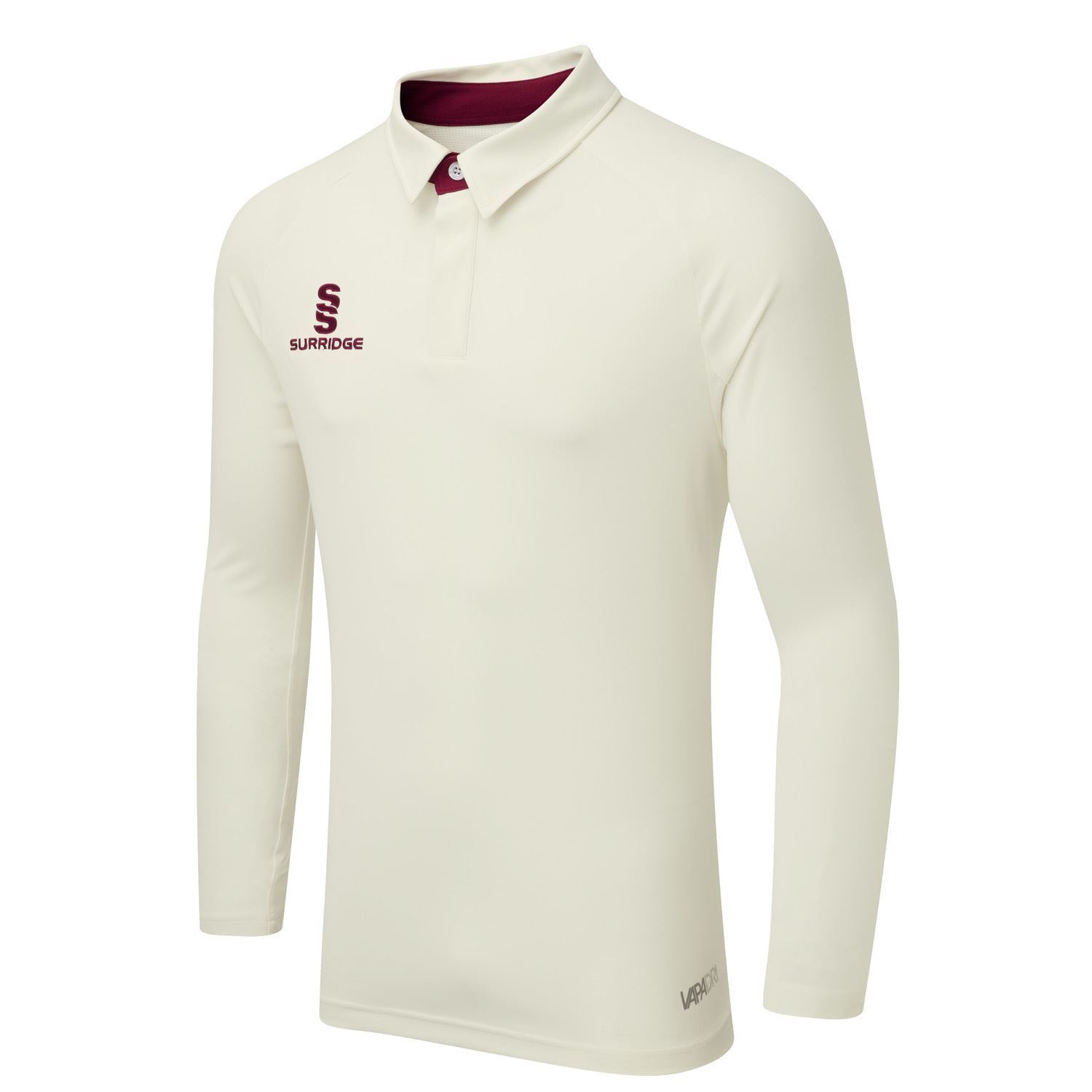 Our new Ergo shirt with VAPADRI technology and Lycra stretch mesh panels has been specially designed to support professional play. Performance Pro slim-fit shirt with Polyester/Lycra mesh on back and underarm for ease of movement during play. Colour:- Ivory 2nd Colour:- Maroon Fit:- Slim Fit Fabric Type:- Performance Polyester Mesh:- Mesh Back & Underarm Buttons:- 3 Surridge Buttons on Contrast Placket Hem:- 2.5cm Coverseam Hem Embroidery:- Embroidered Surridge Logo on Chest Embroidery:-Embroidered Surridge Logo on Back Neck